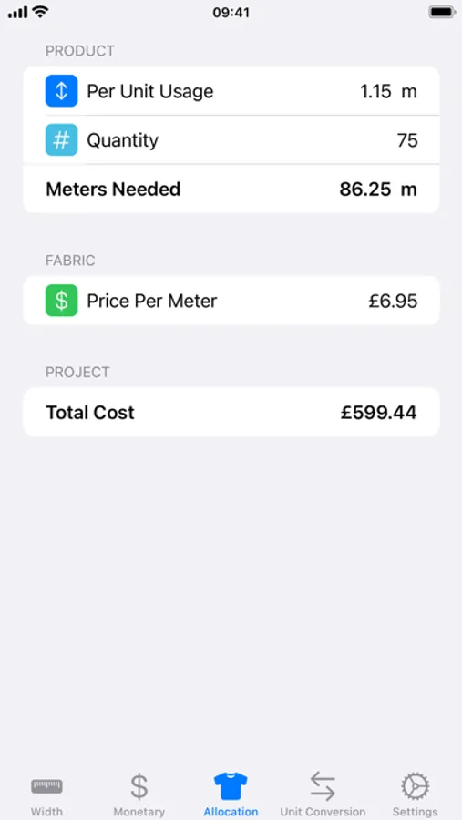 • Allocation – Metric Mode: Calculate Total Cost based on Per Unit Usage between 0.05 m and 100.95 m (in 0.05 m increments), Quantity from 1 to 100 units (in 1-unit increments), and Price Per Yard for prices between 0.01 and 999.99 (in 0.01 increments).