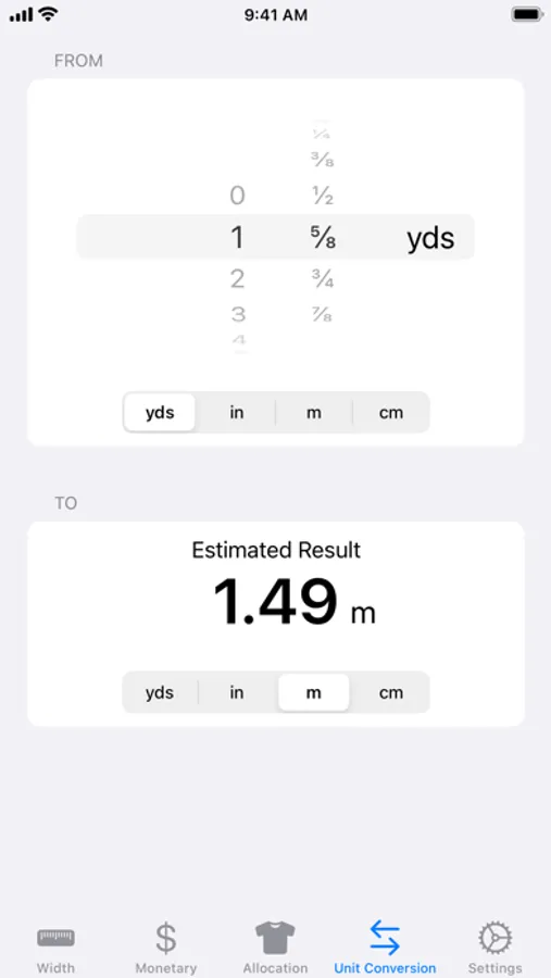 • Unit Conversion – Convert between yards, inches, meters, and centimeters. From yards/inches between ⅛ yd/in and 100 yds/in (in ⅛ yd/in increments) or meters/centimeters between 0.05 m/cm and 100.95 m/cm (in 0.05 m increments). Estimated Results in imperial units can be toggled between decimal and fractional result rounded up to the nearest ⅛ of a yard by simply tapping the result.