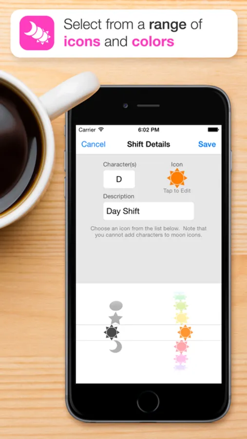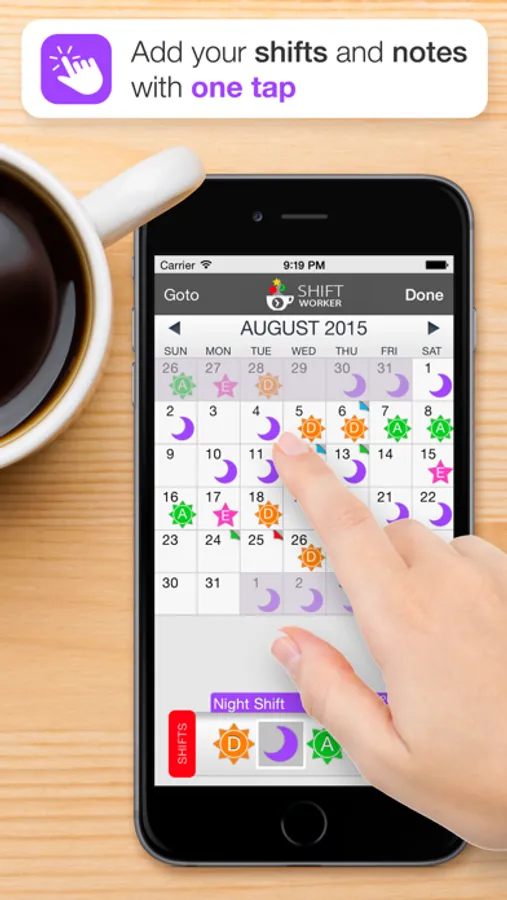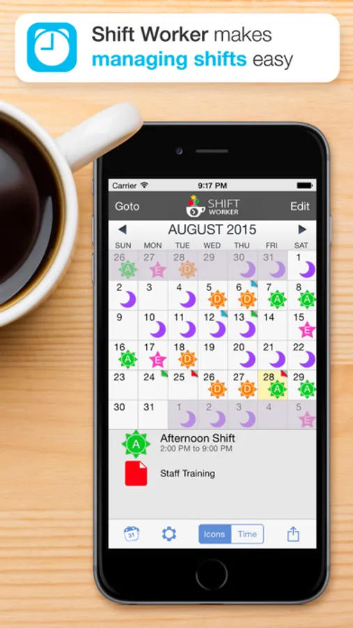 Shift Worker allows you to create your own types of shifts by combining visually-attractive icons with letters/numbers so that they can be easily identified at a glance. By including a range of icons (such as suns and stars for day and night shifts) in a variety of colors, any combination is possible for all types of shifts.