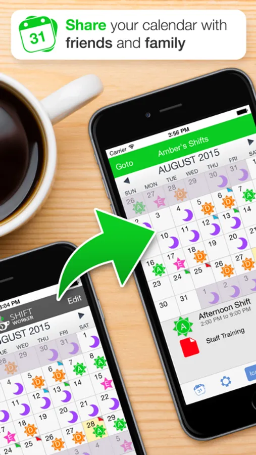In addition, Shift Worker allows you create multiple calendars to see friends and family shifts! You can send your shifts to others so they can also see your shifts at a glance as an image or in their copy of Shift Worker. To make things even simpler, you can even save your shifts to your iPhone/iPod's background so that referring to your upcoming shift schedule is as simple as picking up your iPhone/iPod.