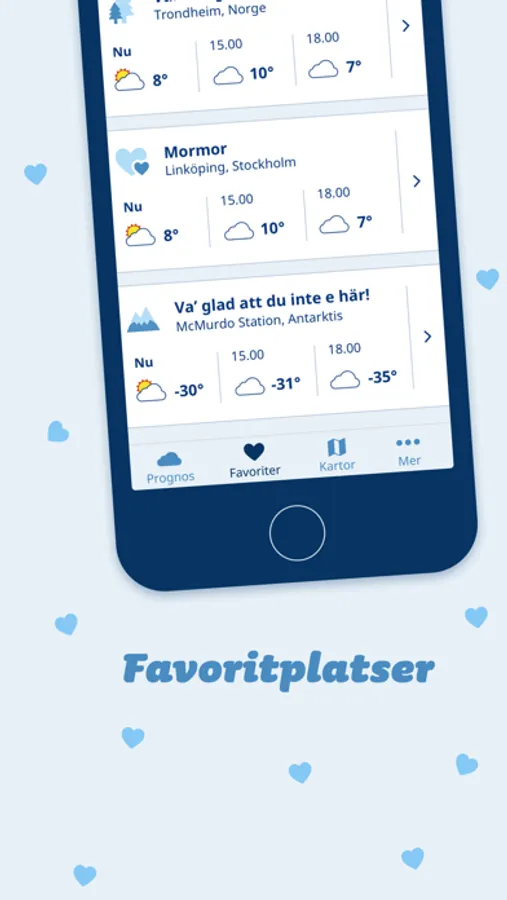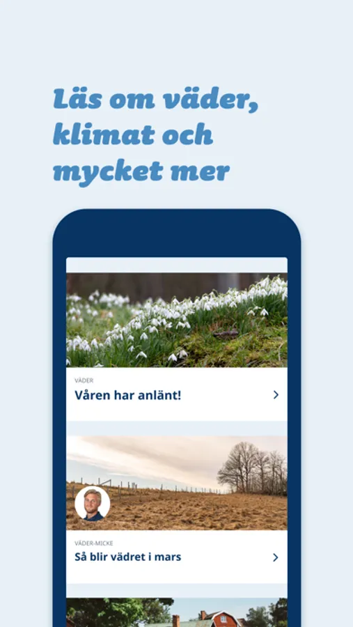Vi har också vädret i diagram (vänd på telefonen till liggande läge), väderkartor för Sverige som visar nederbörd, moln och temperatur, kustkartor med vind, våghöjd och ytvattentemp.
