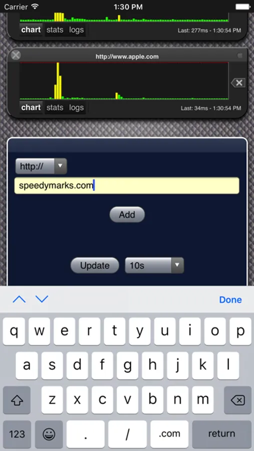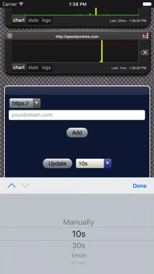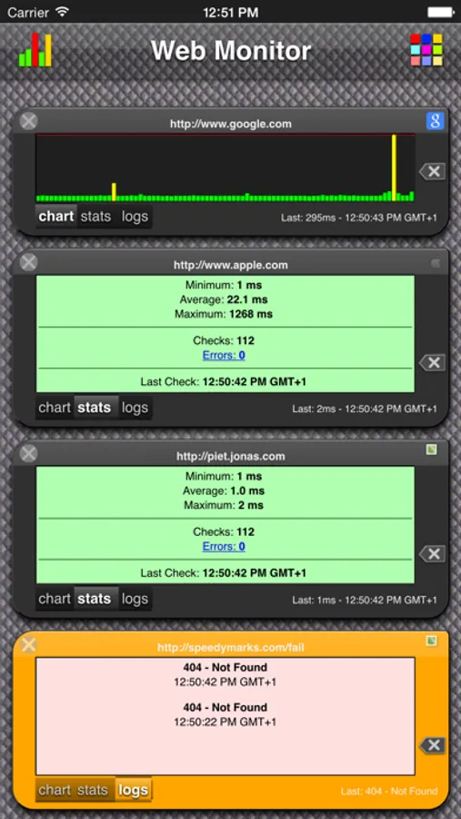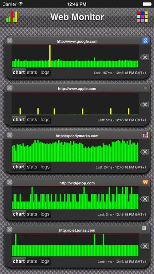 Monitors your servers or any other web site. The application checks the response time periodically with a HTTP HEAD request which doesn't put much impact on the server. It shows a response time chart, response time statistics and has an error log where you can see when and why requests to the server failed.