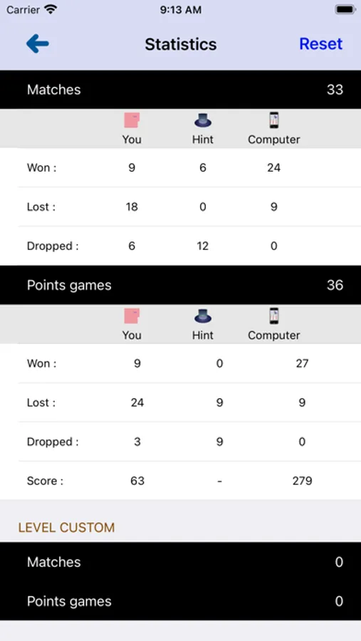 - Game statistics for each level