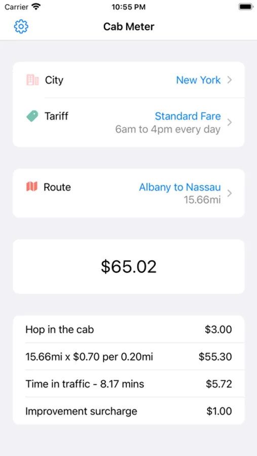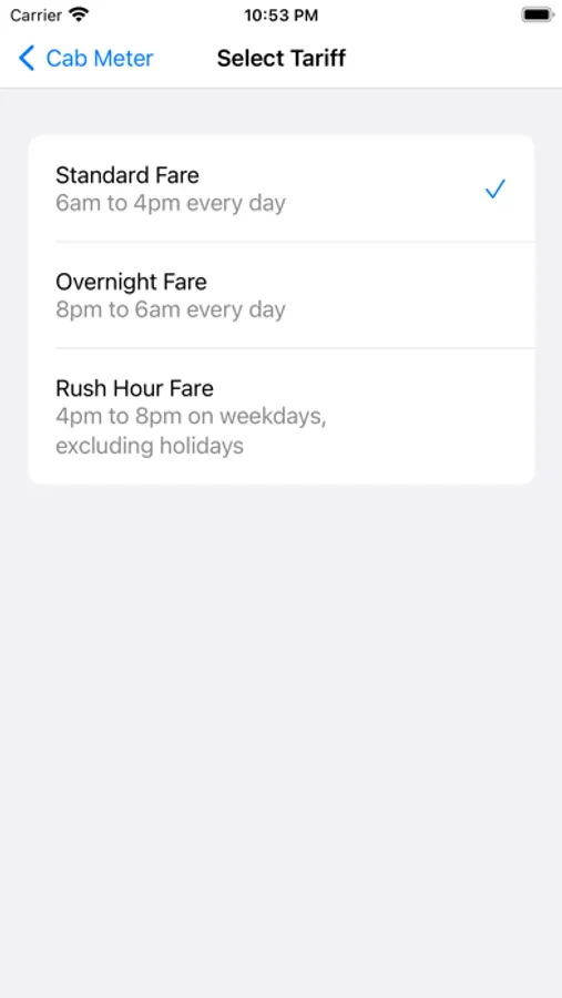 - Cab Meter - USA calculates fares from the latest tariff for your city. It takes peak/off-peak rates and phone booking charges into consideration. Traffic is calculated on an approximation. It does not take toll fares into consideration. So, treat this as a guideline only.