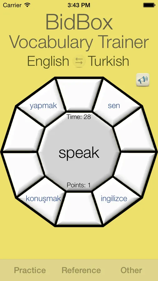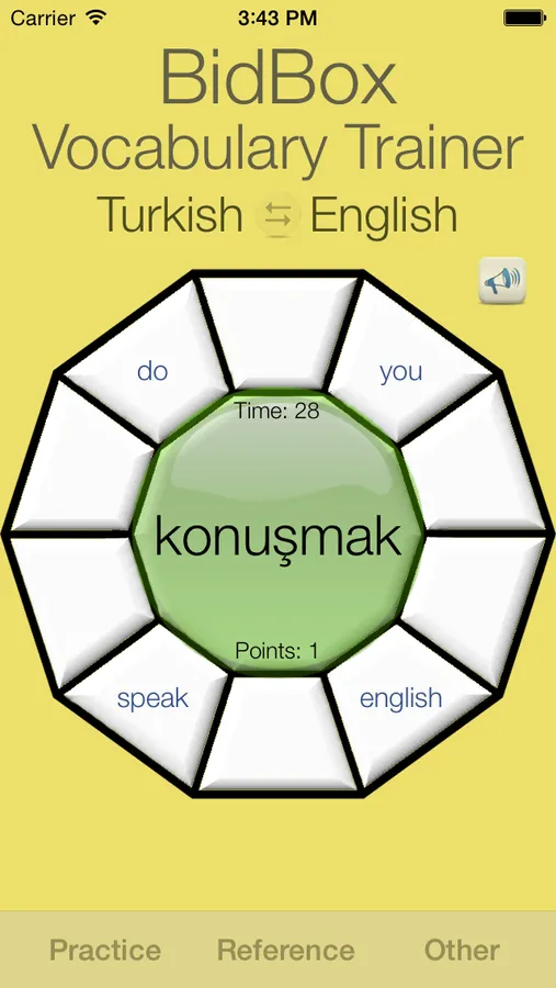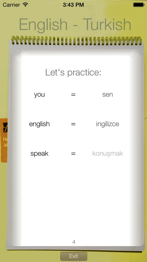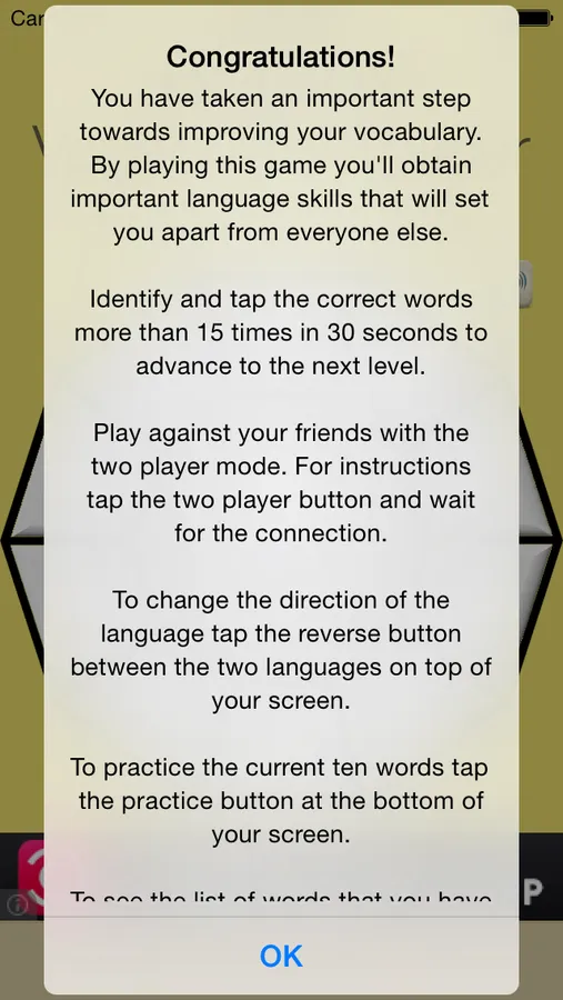 This game let's you build your vocabulary with just a few words at a time. You'll repeat the same words until you can confidently identify and select 15 correct answers in 30 seconds. This system permanently places the association of each word to its English counter part into your long term memory. It is a very natural way to learn a new language.