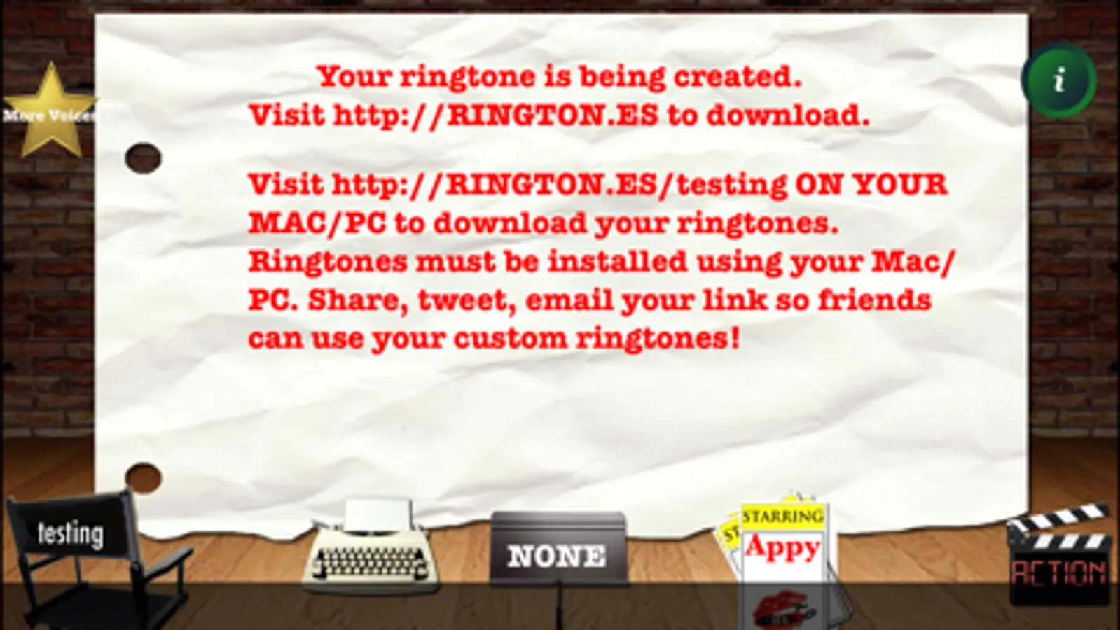 Retrieve ringtones at http://RINGTON.ES by logging in with the same ID you entered when you first ran the app! This way, you can select which custom ringtones you like, and you don't have to worry about getting 100's of emails going to your spam folder! Ringtones must be installed via iTunes on your Mac or PC.