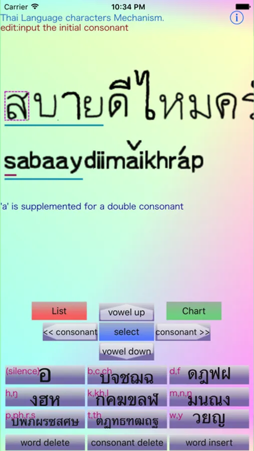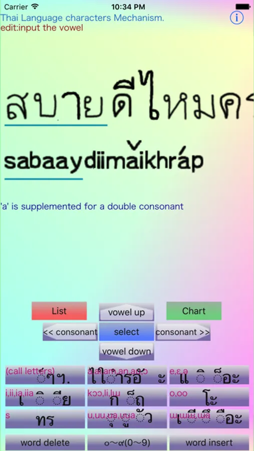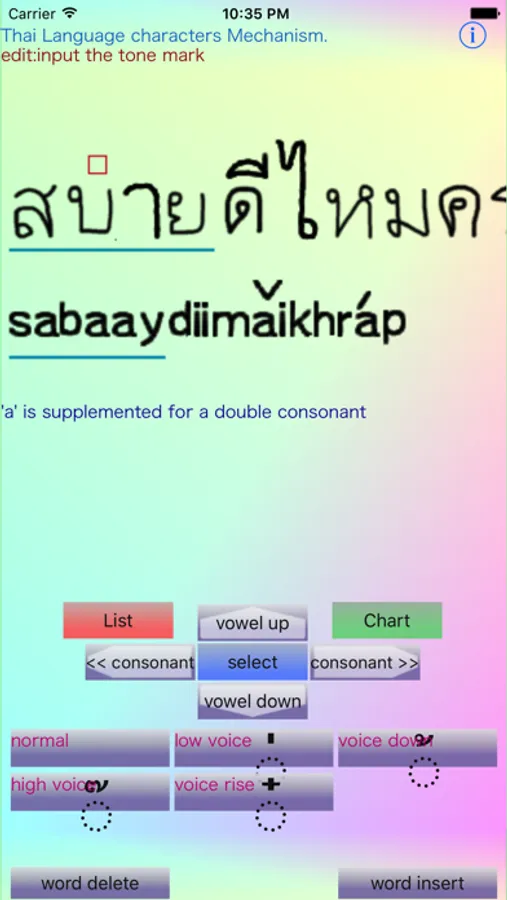 Thai consonants, Thai vowels, Thai number, repetition mark, ellipsis, supported by the app.