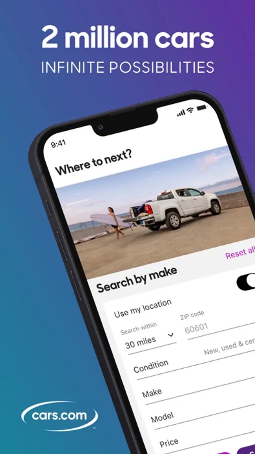 Shopping for a new or used car or truck? Download the free Cars.com app and start exploring every possible car for every possible you. With millions of vehicle listings, over 10 million dealership reviews, advanced search filters, and shopping tools to give you transparent pricing and real offers on your trade, the next step in your journey starts here.