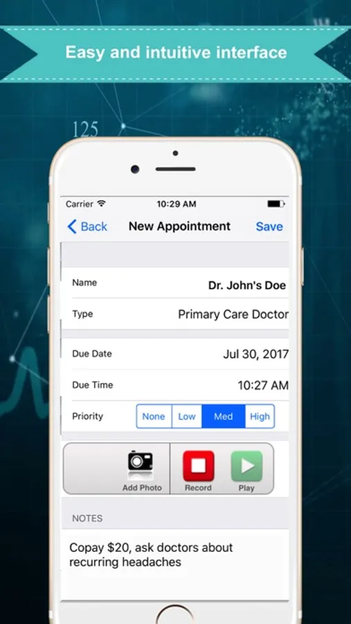 An easy-to-use, full featured medical appointment reminder. Get instant (real-time) alerts on your iPhone & iPad as a reminder when your medical appointment is due. BONUS Features: It even has Voice notes and ability to digitally record and save photos. Jot down questions to ask during your next doctor's visit. Helps Patients digitally record conversation with your doctor via voice, text and photos.