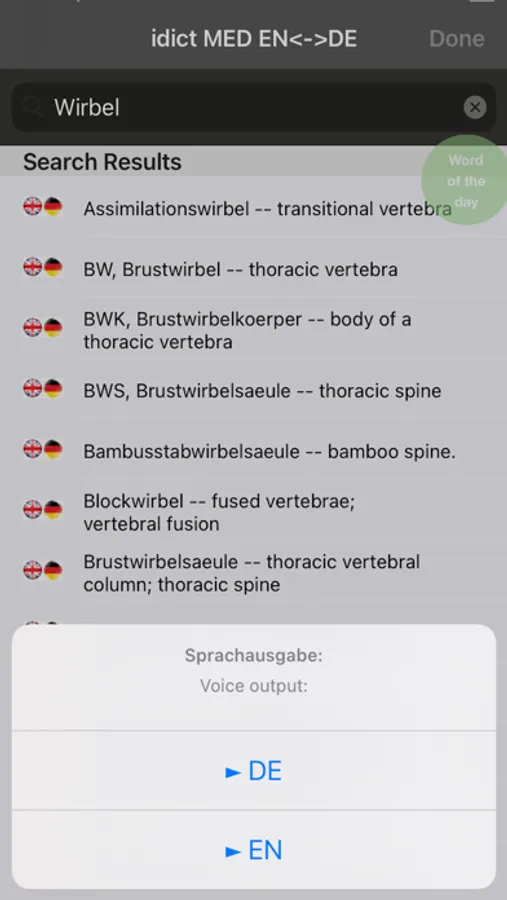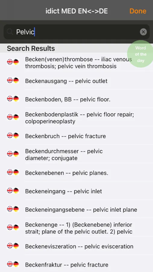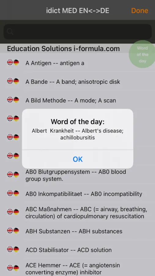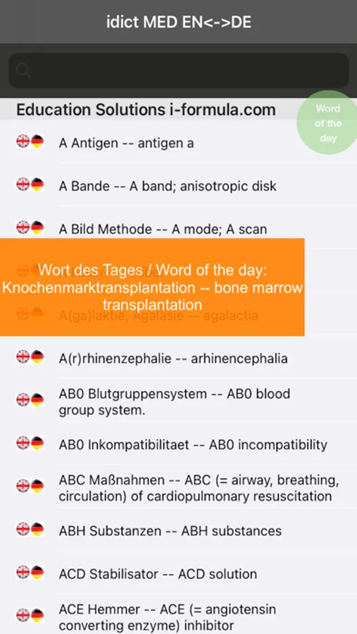 idict med is a medical German to English and English to German dictionary (vice versa) full searchable, including more than 30.000 medical vocabularies and phrases (German and English) of medicine!