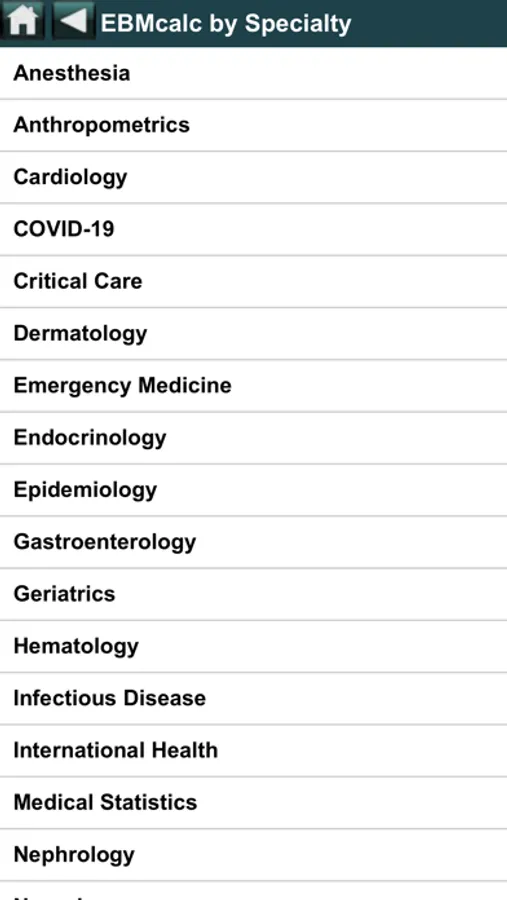 Exploring EBMcalc by Specialty reveals the extensive knowledge base and literature review presented in EBMcalc. Specialty indexes include: