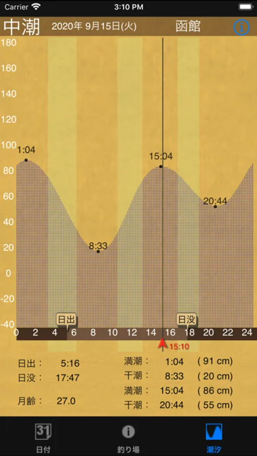 ・詳細情報は、日出・日没・干潮、満潮の時間/潮位、また月齢を表示します。