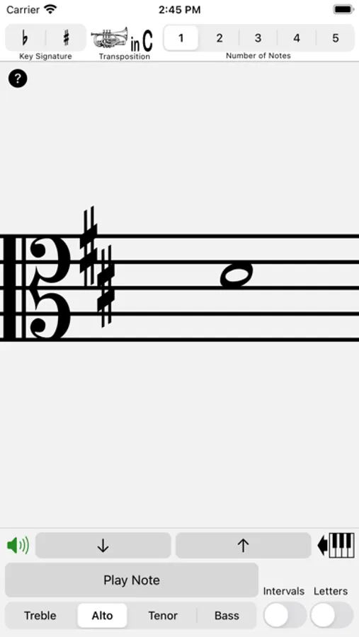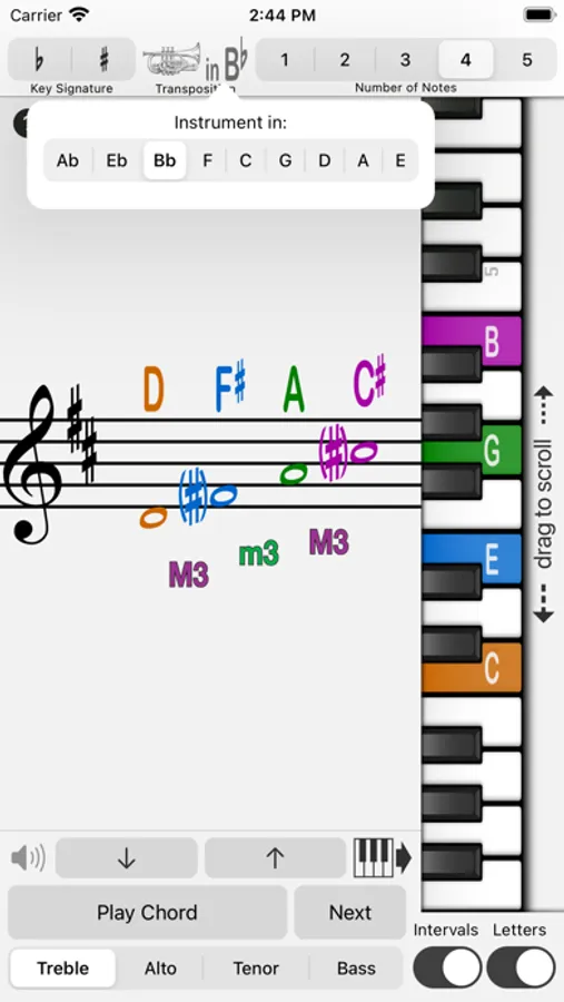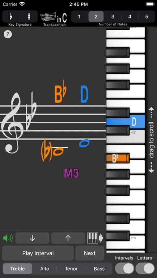 Using the Staff (transposed notation): Simply touch and slide up and down on the staff to select the note, slide to the right or left of the note for sharps and flats.