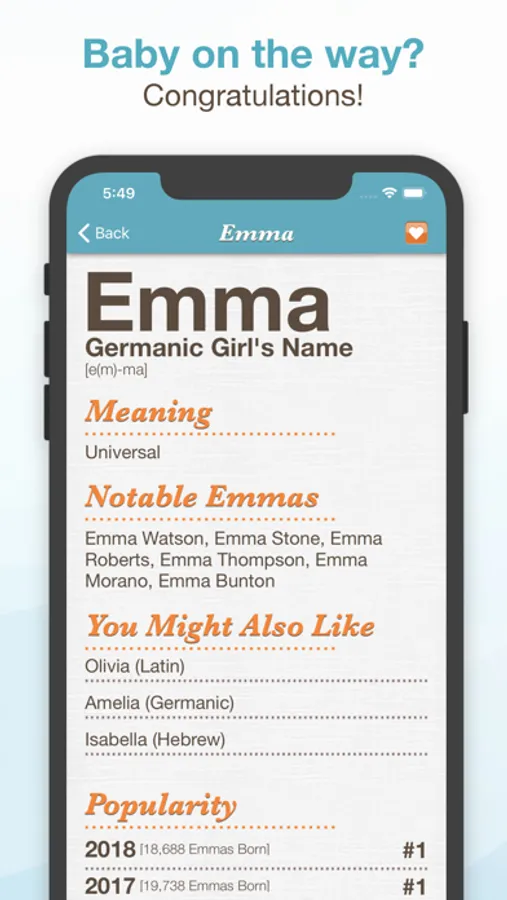 Get the #1 baby naming app! Better than any book, browse through thousands of possible baby names using a friendly, easy to use interface. See the details of each name, including origin, meaning, pronunciation, and even how popular the name is. Still can't find a great name, use the custom search feature to narrow down your results by trends, popularity, origin, parts of a name and even the meaning of the name!