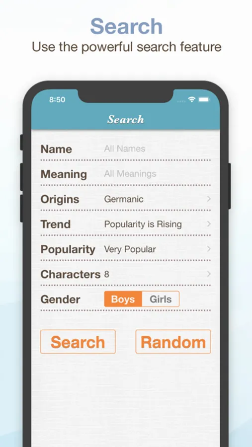 • Super search: by name, meaning, popularity, characters