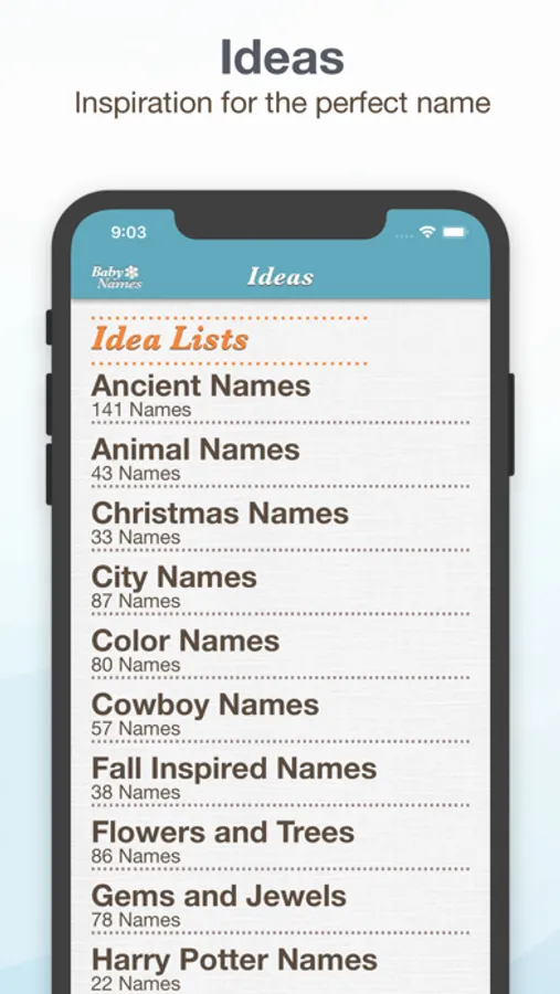 Loads of other features, including our new idea lists. Christmas names, seasonal names, strong names, nature names, and tons more lists to help you find the perfect name for your baby! Once you find the must-have name, easily save it to your favorites list and see what it looks like with a middle name and last name.