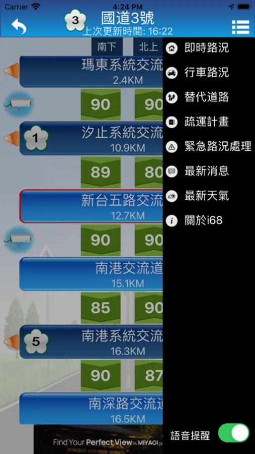 【i68即時路況】為使駕駛者輕鬆掌握路況資訊,提供行駛國一、國三的最短旅行時間推估,及完整的替代道路資訊,做為您出行前的參考。