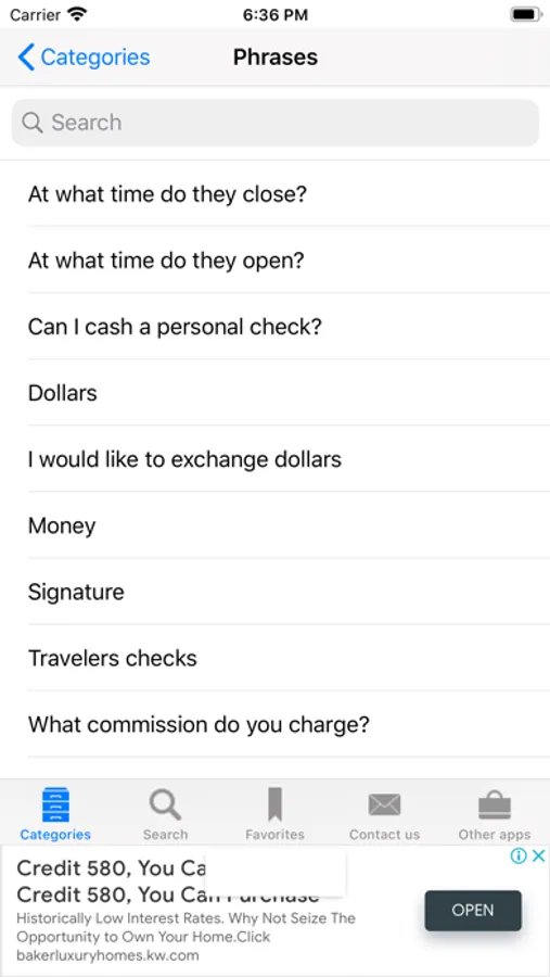 3. 700 WORDS OR PHRASES. Choose from commonly used search phrases such as I want to exchange dollars, Take me to the airport, Can you help me etc and translate them to French