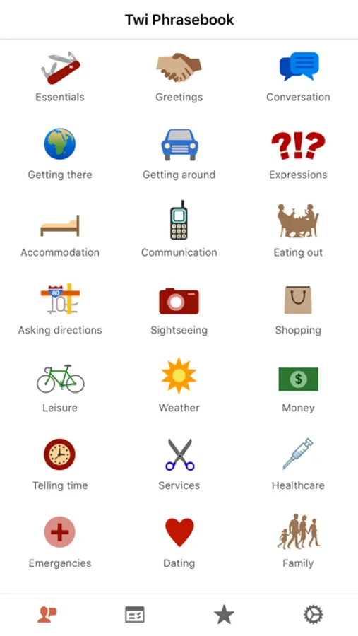 Essentials, Greetings, Conversation, Getting there, Getting around, Expressions, Accommodation, Communication, Eating out, Asking directions, Sightseeing, Shopping, Leisure, Weather, Money, Telling time, Services, Healthcare, Emergencies, Dating, Family, Food and Religion.