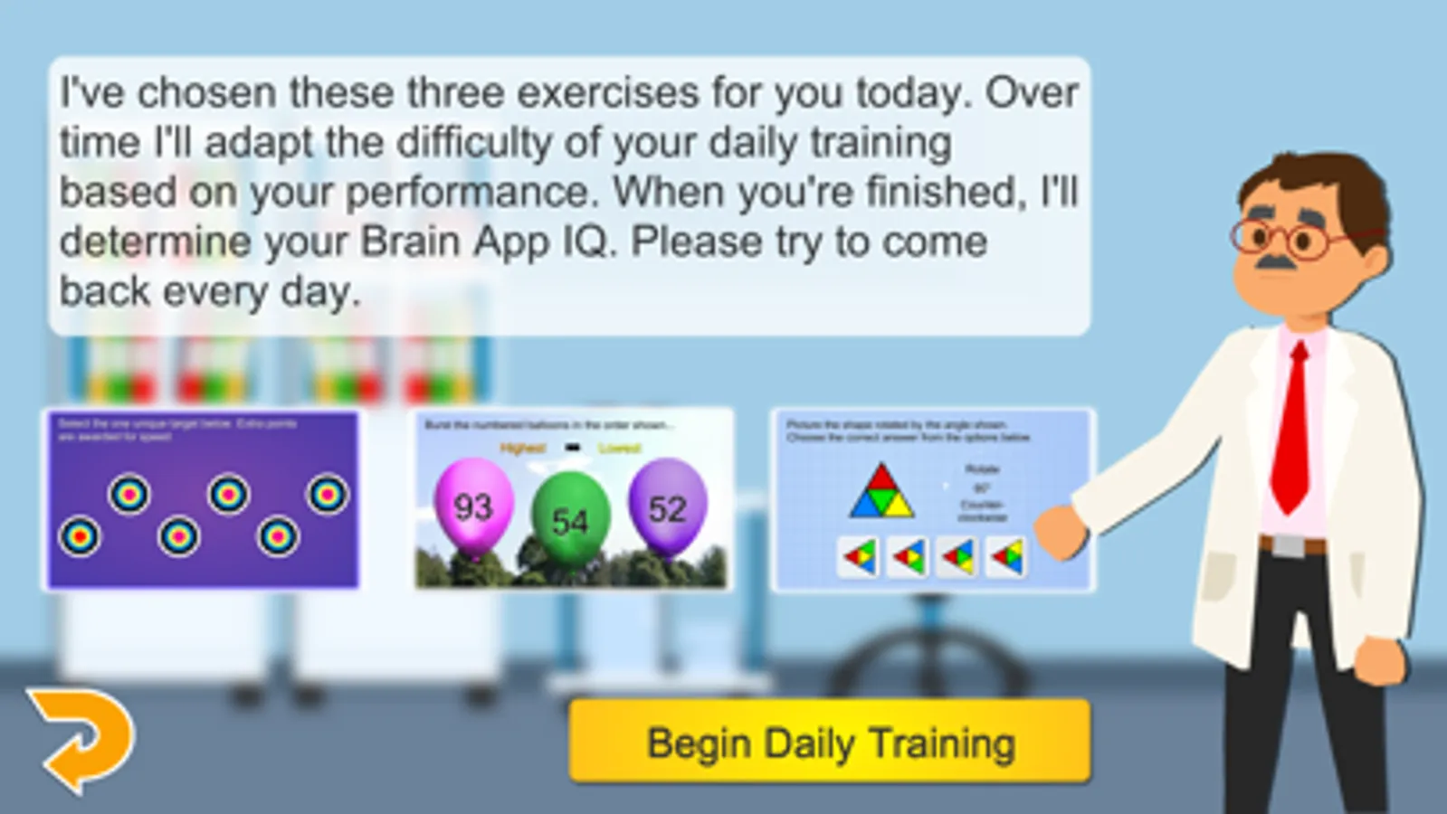 Daily Training - Brain App provides a different selection of three exercises each day of the week. Complete Daily Training to discover your Brain App IQ.