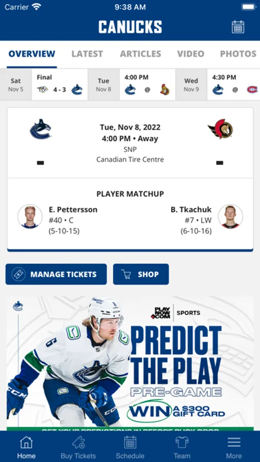 Welcome, Vancouver Canucks fans! This is your single-touch access to the Vancouver Canucks. Get the latest Canucks news, scores, stats, media, and game-day information. The Canucks app also allows you to manage your tickets, participate in province-wide 50/50 draws, play games on the Rogers Arena video board and more.