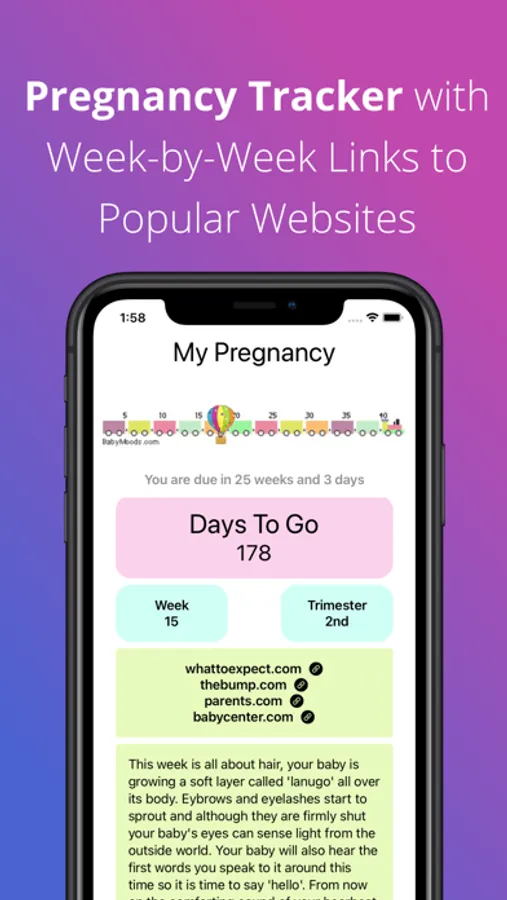 If you are looking for an app to be your companion and guide through your pregnancy then look no further. BabyMoods Weekly Pregnancy Tracker will keep you up to date throughout your pregnancy. It includes unique features like week-by-week direct links to the current week of your pregnancy for the popular pregnancy websites. These currently include: