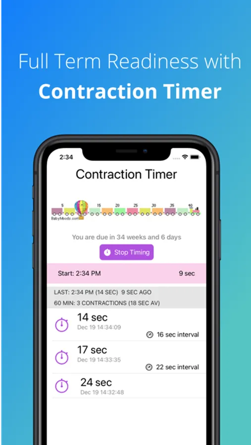 - Contraction Timer including a live count of how long it has been since your last contraction