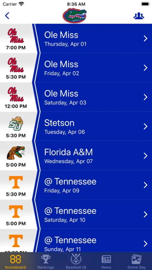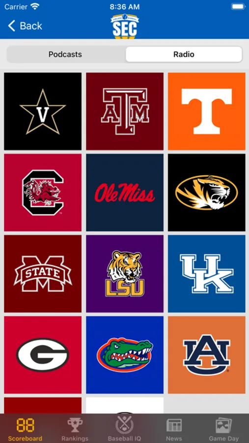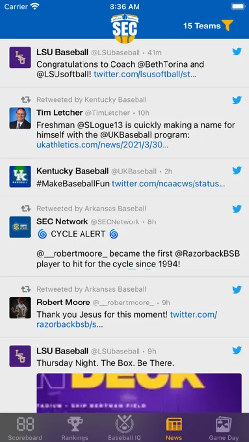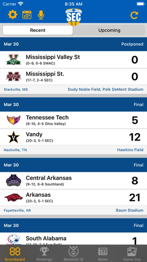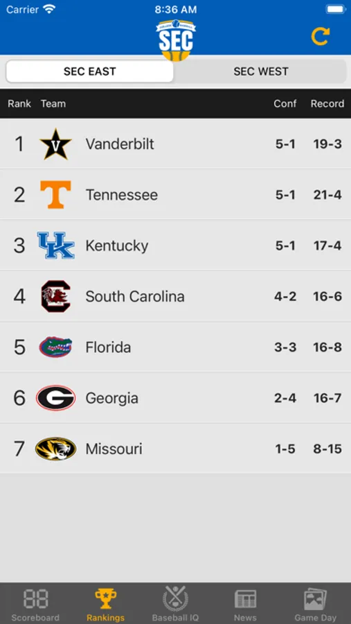 Like the paper pocket schedules, except with Scores, Rosters, Directions, Standings, Game Day Pics & News. For all of your favorite SEC Baseball Teams.