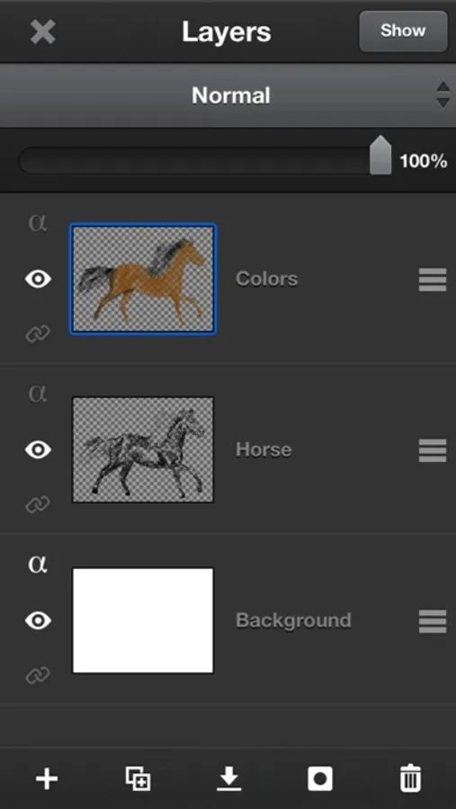 - 21 layer blending modes: normal, multiply, add, difference, screen, overlay, hue, saturation, color, value, ...