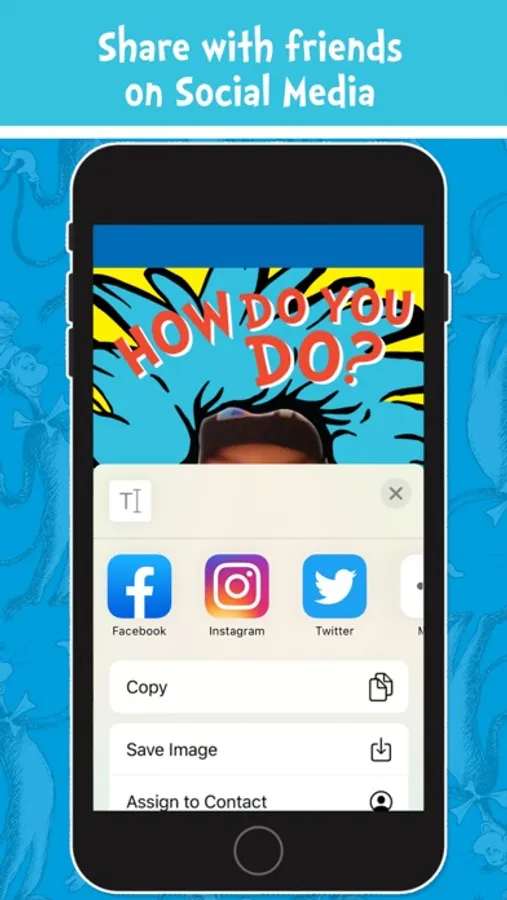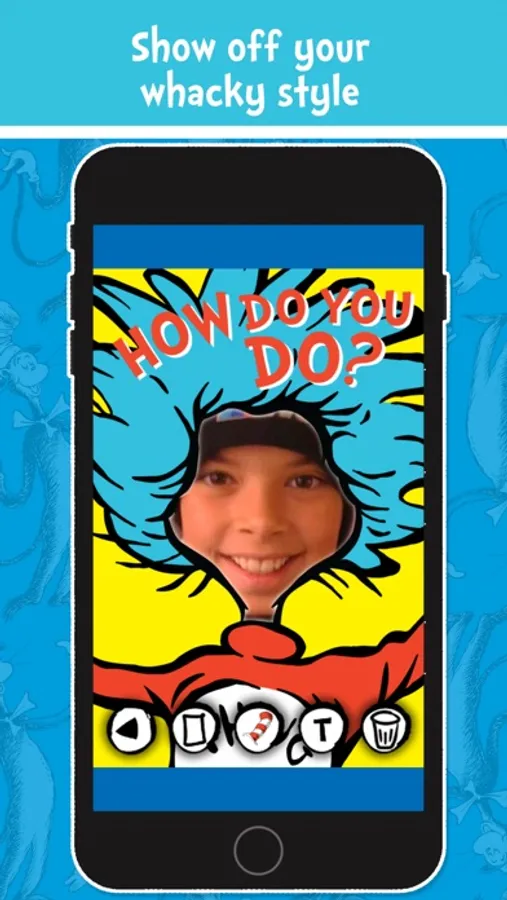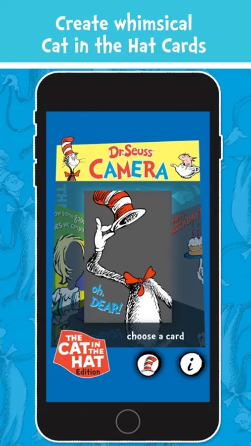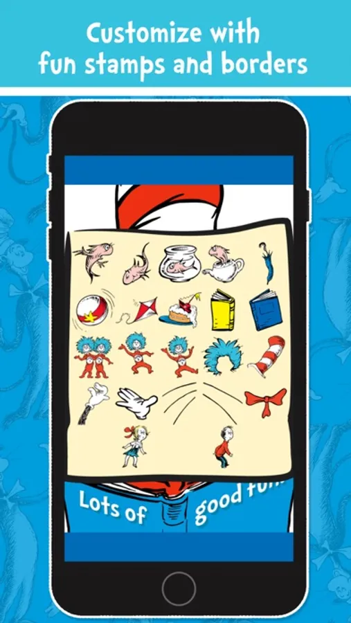 Take pictures with Cat in the Hat characters or choose to become the Cat in the Hat, the playful Things or even Sally or her brother. Personalize cards with comical and colorful stamps, borders and classic Seussian text. Cat in the Hat Cards can be shared with friends & family on Facebook, Instagram, Messages, Email, Twitter, Airdrop, or saved to the Photo Library.