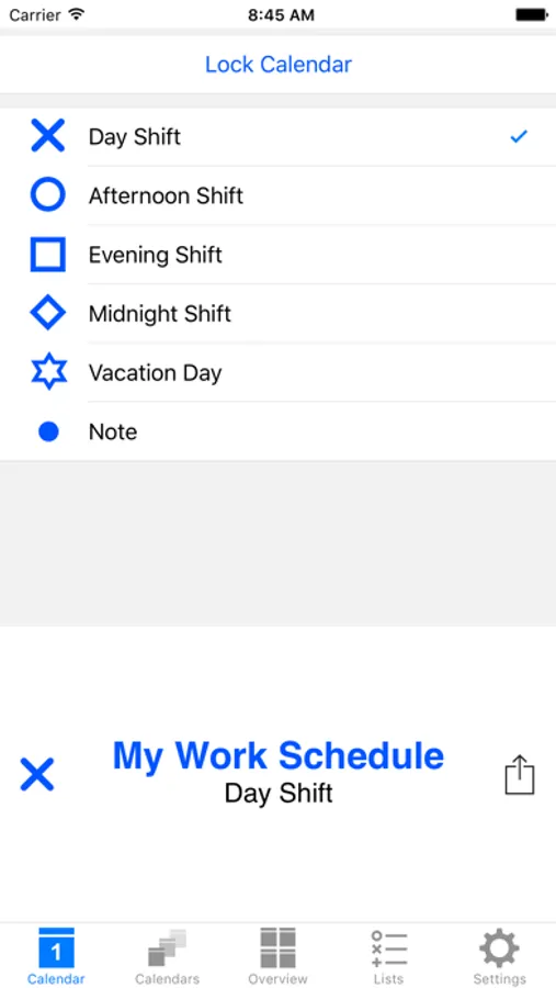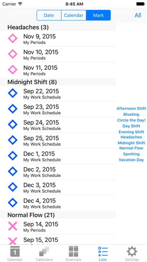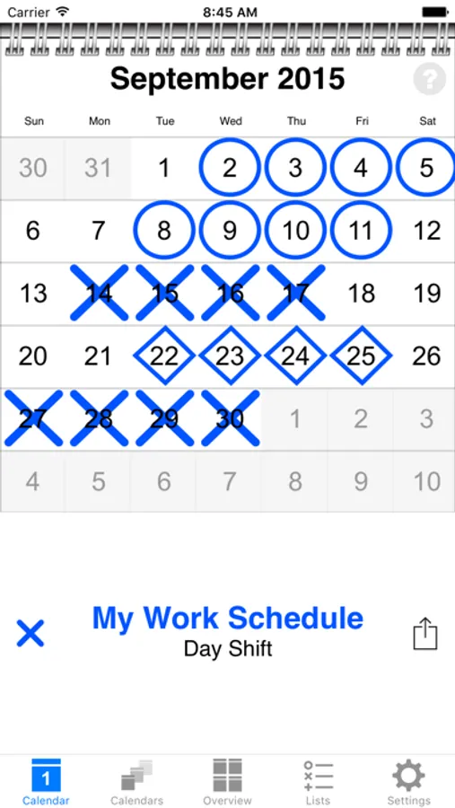 colorCal+ lets you create an UNLIMITED number of calendars that you can create with ANY color you wish. Each calendar includes its own set of marks with individual meanings that you choose. You can also write a brief note for every day for every calendar. Now you can create DOZENS of separate colorful calendars for tracking your health, your "special" days, your work schedules and shifts, employee schedules, your days with the kids, your exercise routines and workouts, your moods, your kids' music lessons, and hundreds of other uses you have not even imagined.