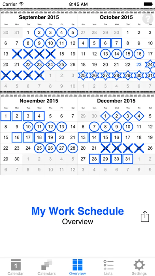 colorCal+ lets you look ahead or back four months at a time, and see marks for all four months at a glance! Also, for either the single-month view or for the four-month view, you can email a picture of the calendars, and for the single-month view you can also send along a list of the marks for that month. Send your calendar to your friends, your boss, your employees, your family, etc.