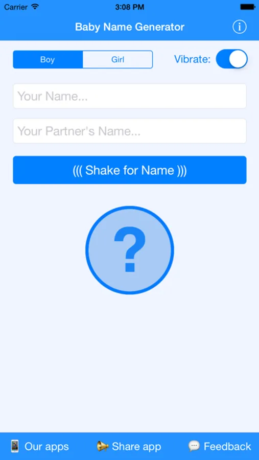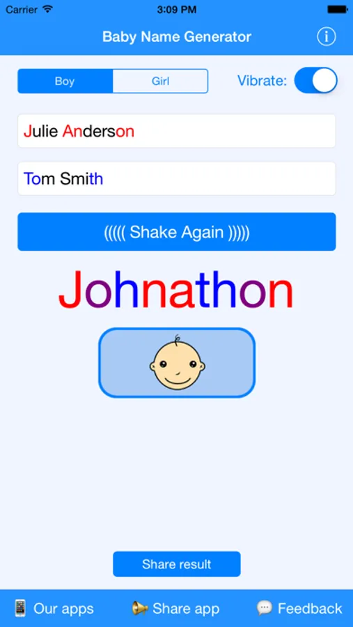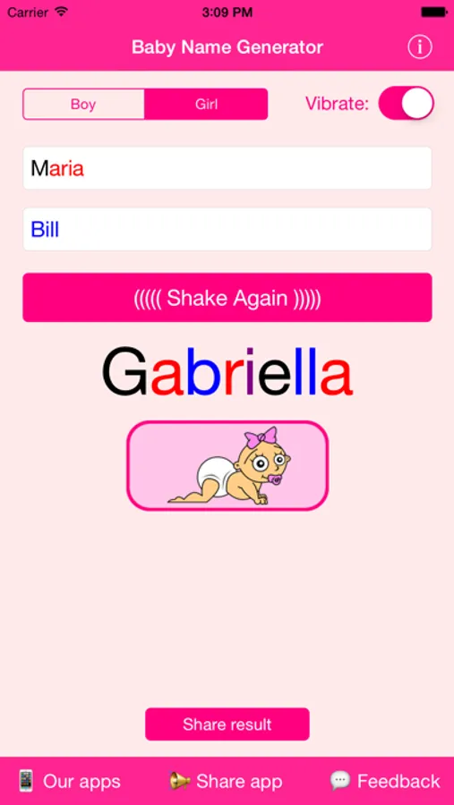 Use the 'Boy or Girl' switch to select gender and have vibration switched on or off.