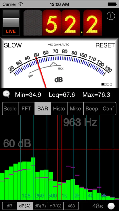Peak and average values are displayed below and are held until you touch the 'reset' label. The videos on Youtube reveal more details.
