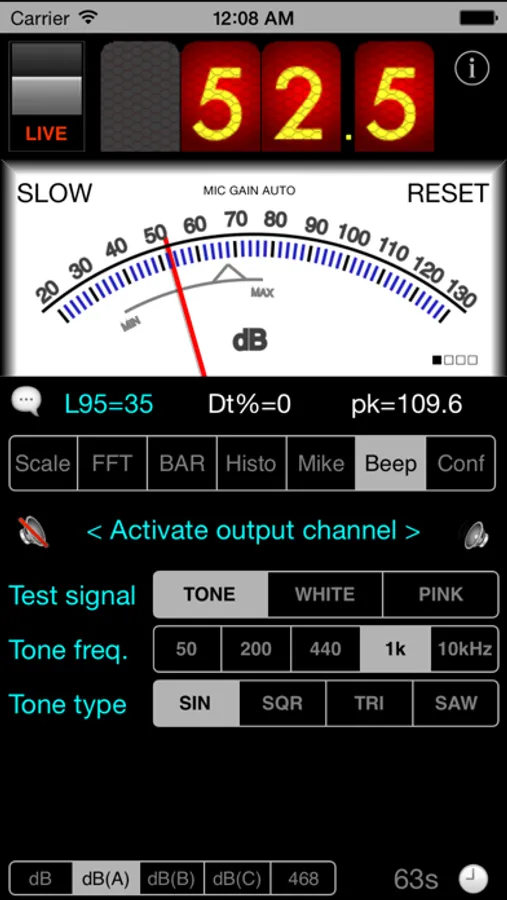 A test tone at 1kHz or a white noise or a pink noise can be generated and sent to right and/or left outputs (select the type you want in BEEP tab). This FFT view - more precisely an upsized version of it - can be exported as a picture in your own photo library, using the camera button (when display is frozen only). This picture can be exported in a mail as well.