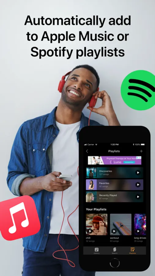 • Build personalized playlists through Apple Music or Spotify (SoundHound account and music subscription required)