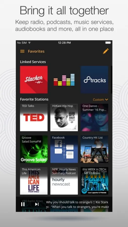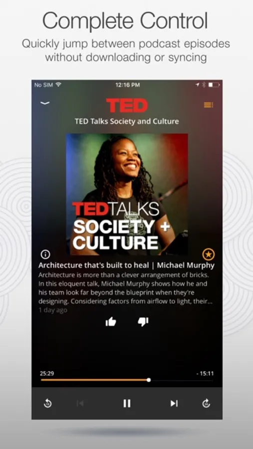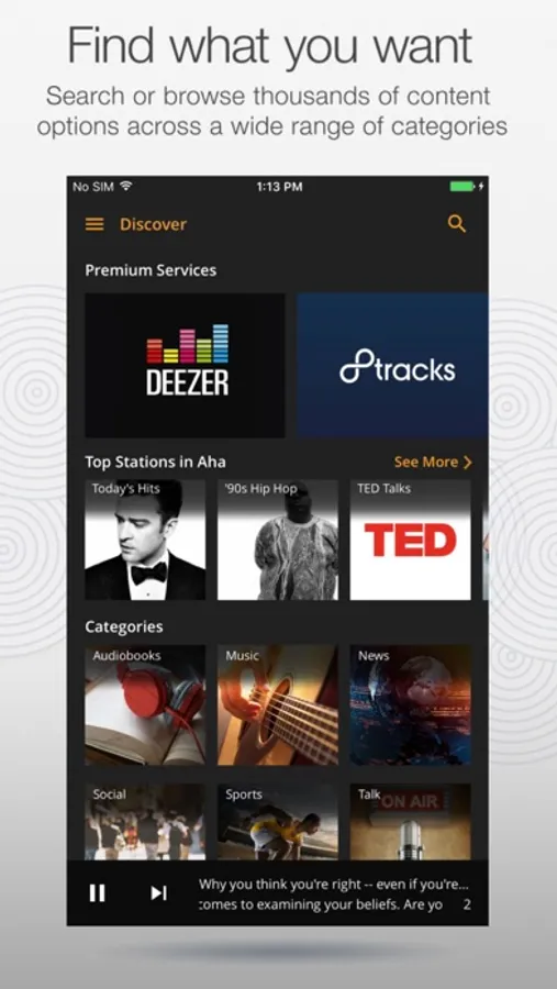 Choose from a virtually endless set of options, and let Aha manage the content for you in the cloud. Aha remembers where you left off, and can pick right back up the next time, even if you are bouncing between multiple episodes of the same podcast.