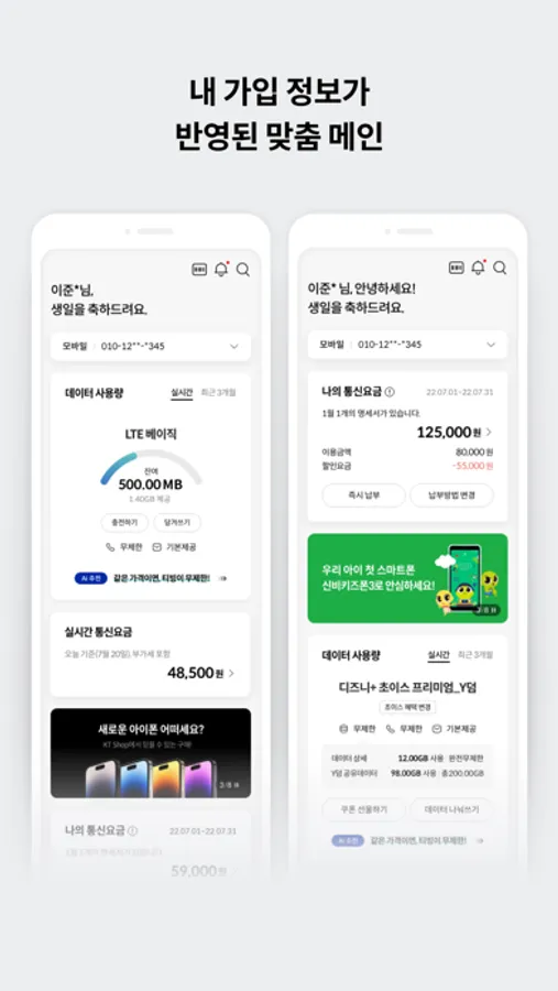 이용량/요금조회, 멤버십, 부가서비스, 맞춤혜택 정보를 간편하게 확인하실 수 있습니다.