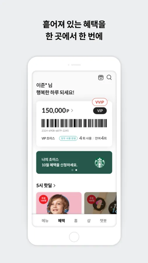 멤버십 이용현황 뿐 아니라 고객별 이용 가능한 맞춤 혜택 정보를 바로 확인하고 이용할 수 있습니다