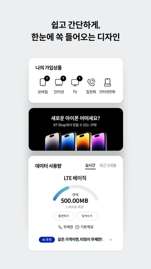 데이터 선물하기, 상품 변경, 신청 등을 한번에 쉽게 할 수 있습니다.