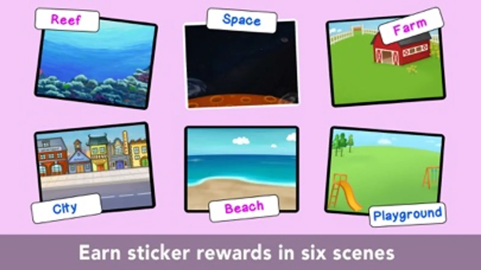 • 7 different sticker reward scenes: space, playground, beach, underwater reef, pirate cove, city, farm