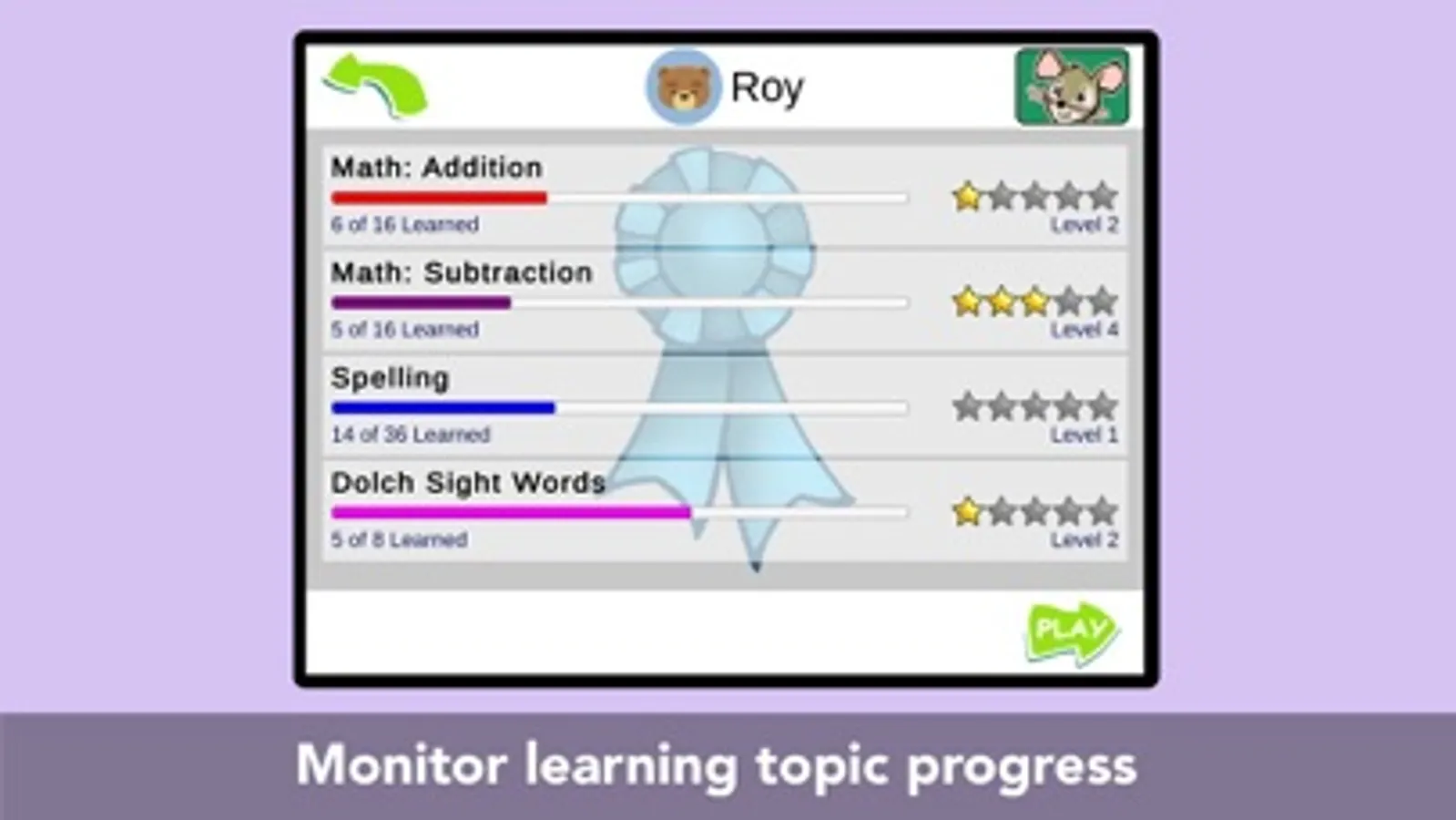 Each child has an achievements screen which motivates and encourages learning by showing progress and levels for each topic. Parents can use this screen to quickly see progress of their child. Parents can select which subjects they want, set different difficulty levels, and even choose specific questions. Parents can also review performance history for each subject to check how their child is doing.