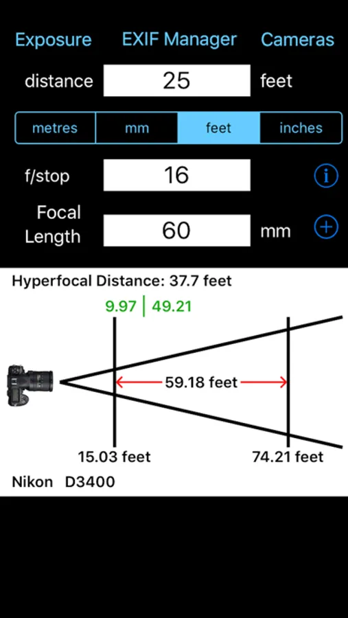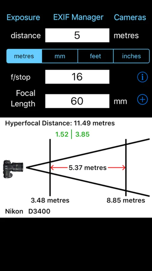 The Depth of Field Calculator allows you to quickly calculate the near and far distances of acceptable focus. Just select the distance you are focused at, the f/stop and the len's focal length and the diagram shows you at what distance acceptable focus starts and at what distance it ends. You can select to express the focus distance in metres, millimetres, feet and inches. Unlike other Apps this App does not use picker wheels for the f/stop and focal length values so you can enter whatever values you want.