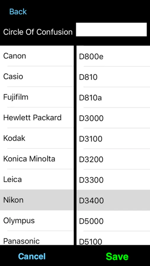 The only other thing you have to do is select the camera you are using. The Camera button takes you to a page with the makers of cameras listed to the left. Select the maker of your camera and then scroll down the list to the model. Select Save and you are now ready to calculate the correct values. The calculations work using a value called the Circle of Confusion. This changes depending on the camera make and model.