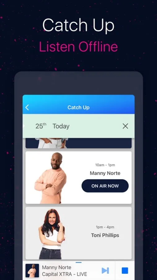 • Catch Up: Your favourite shows from the last seven days are available to listen back to or you can download them – great for offline listening when you’re on the move.