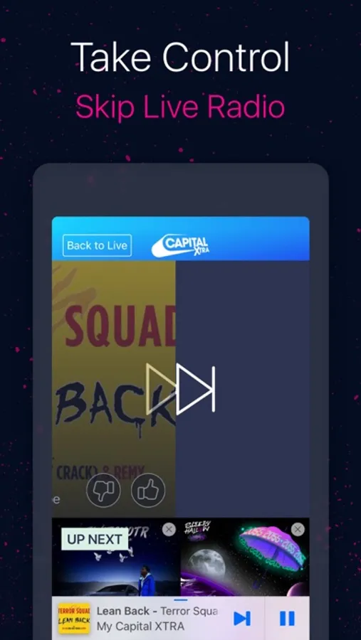 • Take Control: Skip live radio. Listen live to Global’s radio brands and skip* any songs you’re not loving – there’s no limit. Plus like and dislike tracks to get more of what you love. Just swipe away to customise your radio experience.