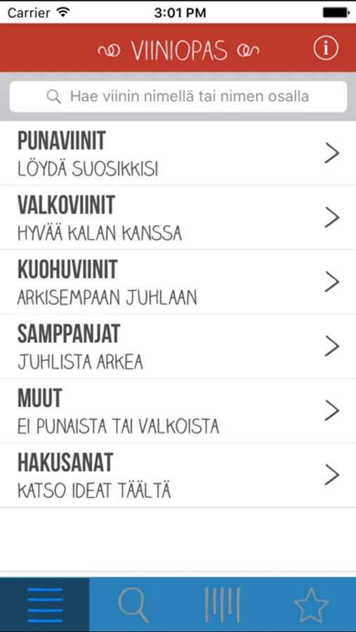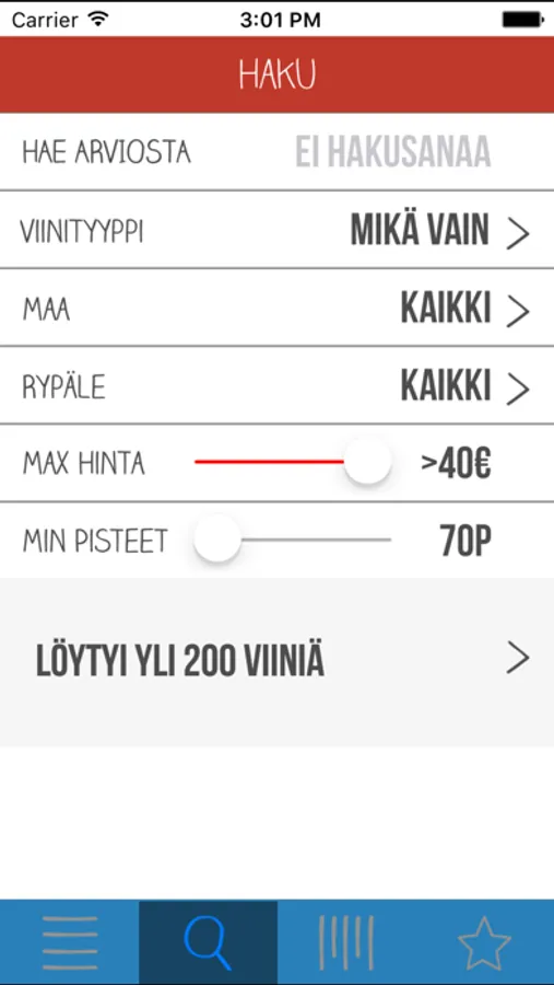 Voit selailla viinejä viinityypin ja maan mukaan, etsiä viinejä nopeasti nimellä esimerkiksi Alkossa kierrellessäsi, tai voit käyttää tarkennettua hakua löytääksesi juuri sen parhaan viinin. Tarkalla haulla voit määritellä: