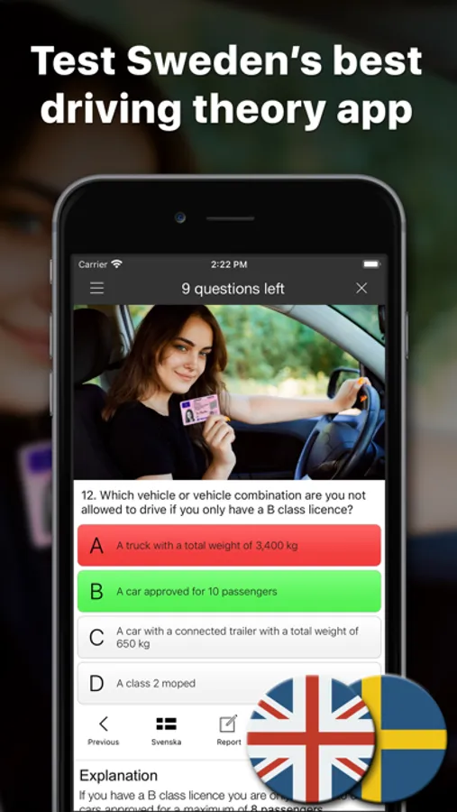 All questions, theory and all other content is available in both English and Swedish. To switch between the languages, simply change the language in your device’s settings. You can also change language back and forth while doing tests, just like on the real test!