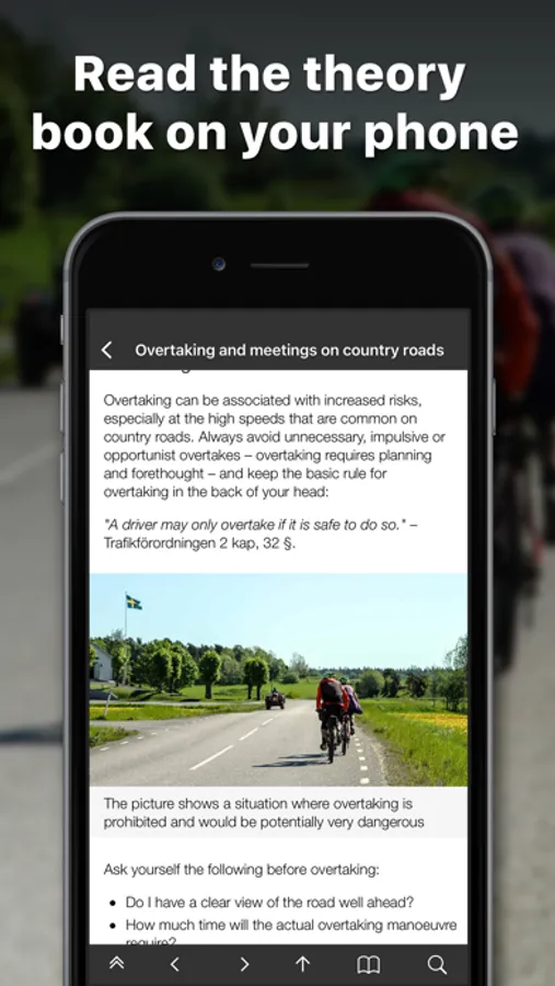 Get iKörkort Lite and read ALL of the driver’s licence theory for FREE. Our licence theory is easy-to-read, full of pictures and examples and contains all the information you need to learn to pass the Swedish B class theory test! The app supports both English and Swedish and you can easily change language while doing tests, just like on the real theory test.