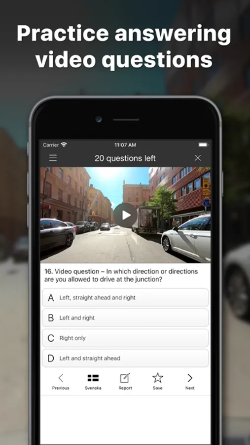• 1,400 driver’s licence theory questions with pictures and videos of real traffic situations.